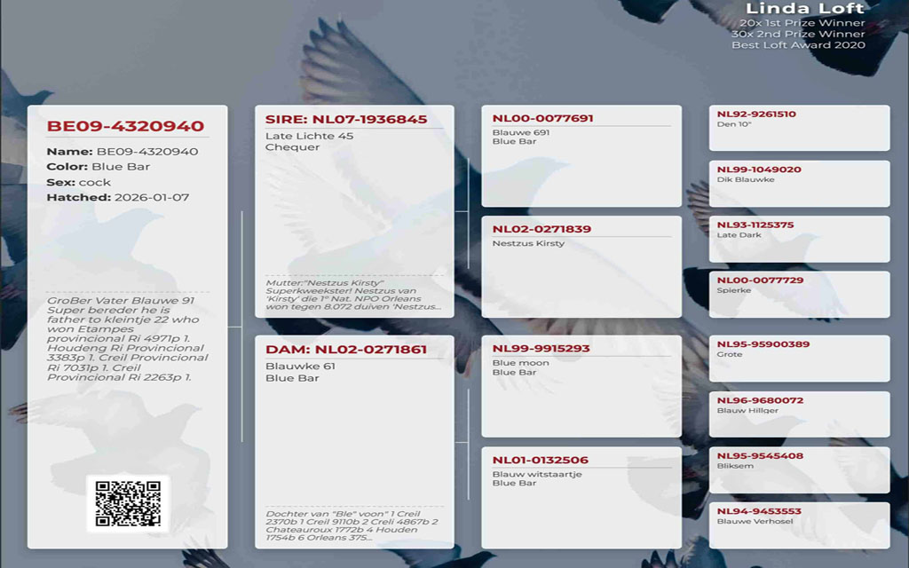Bring Your Pedigrees to Life Embed QR codes directly onto your printed pedigrees to instantly link them to the pigeon’s full digital record. Unlike old-fashioned PC software, our cloud-based technology creates a dynamic profile that is always up-to-date. Anyone can scan the code to view the bird’s complete history, photos, and details instantly. Printed pedigrees are good, but connected, live data is better. Try it out for free.